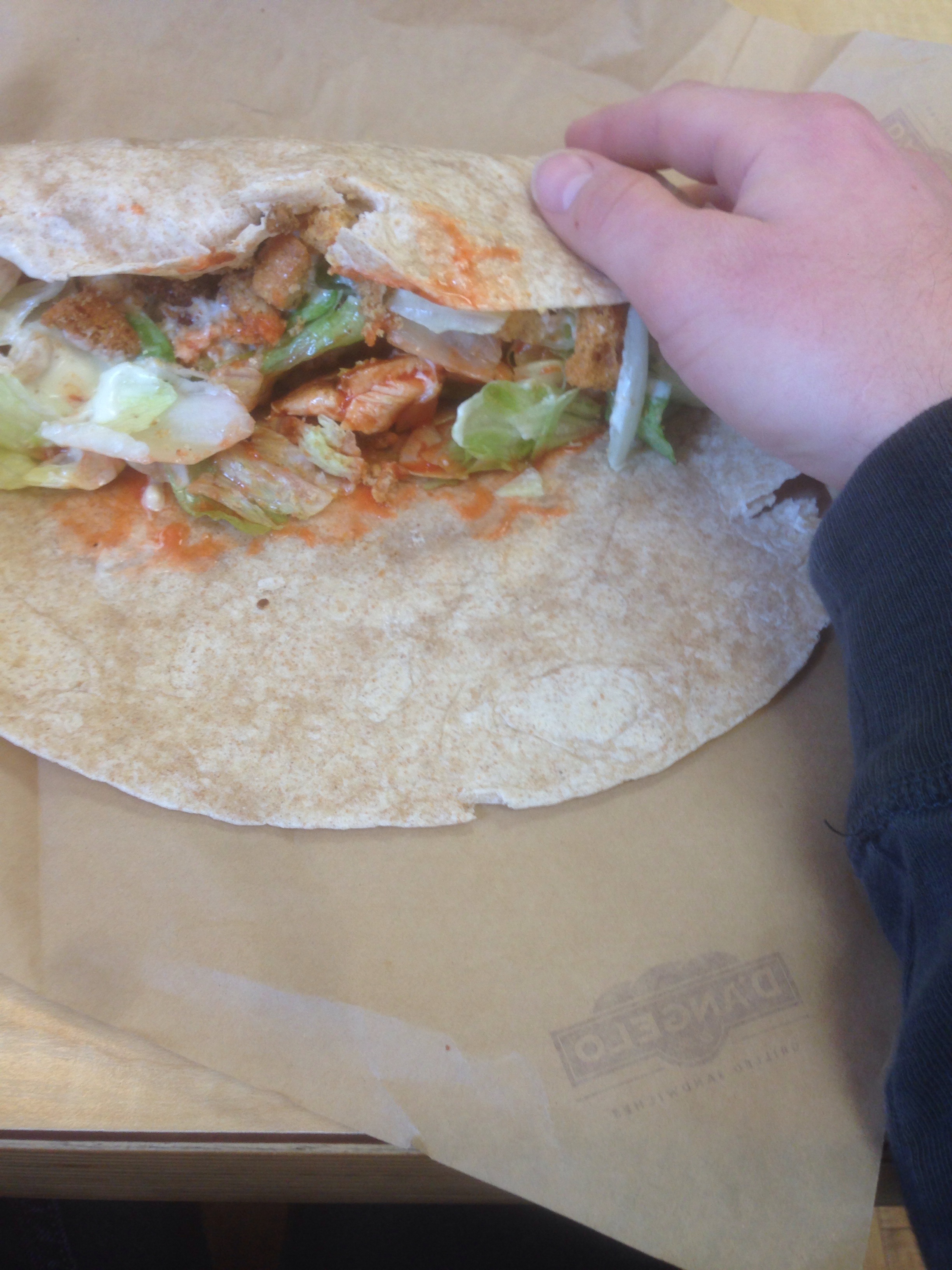 This tasty treat is just hot enough to make your face burn if you eat it fast enough, which I most certainly did. It’s pretty standard with the chicken, lettuce, buffalo sauce, and blue cheese, but the real kicker are the crunchy croutons they stuff in there to take things to the next level.