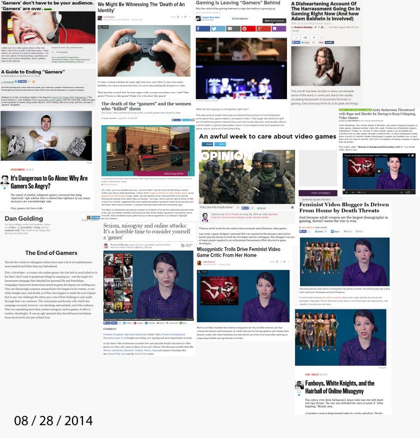 By August 26, gamer Andrew Todd from Badass Digest, said that identifying as a gamer was “like being a moderate Muslim in the middle of the continuing ISIS takeover and oppression of Iraq.” The popular opinion was to see the harassing action of a few criminals hiding deep within the bowels of the Internet as indicative of the larger movement.